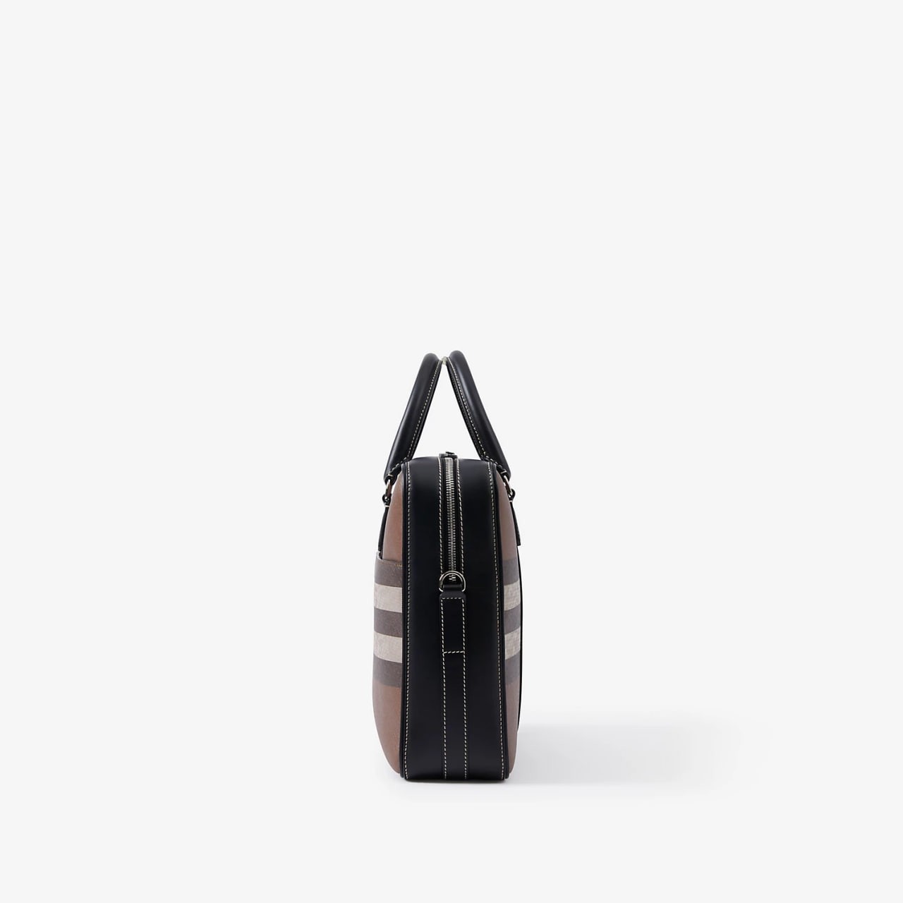 The sophisticated, upright design is embellished with Burberry check and is highlighted by a rolled leather handle at the top and a 3D logo.